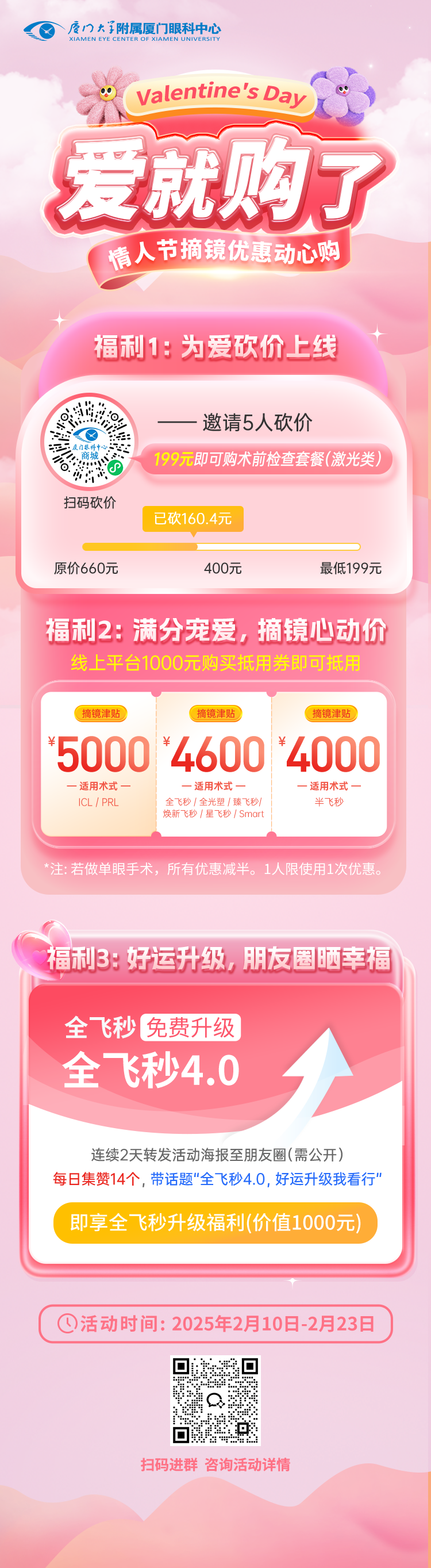 連續(xù)2天轉發(fā)活動海報至PYQ(需公開無分組),附文案“全飛秒4.0,好運升級我看行”,每天集贊14個,即享全飛秒升艙福利,以全飛秒3.0價格完成4.0手術(優(yōu)惠1000元)。