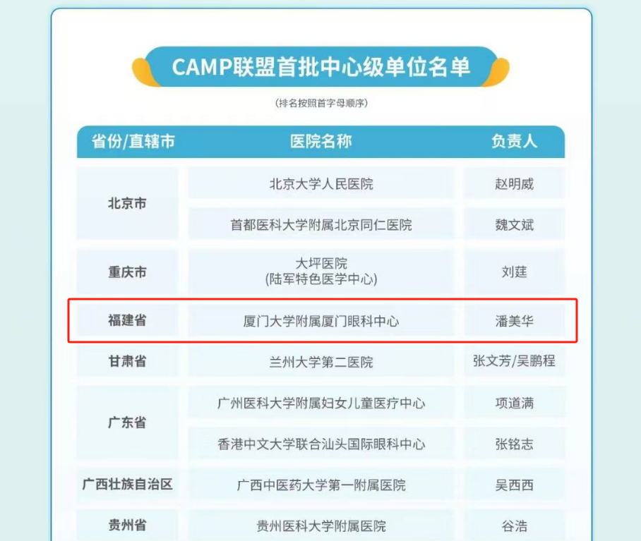 CAMP由國(guó)家眼部疾病臨床醫(yī)學(xué)研究中心牽頭組建,在健康中國(guó)戰(zhàn)略和近視防控政策的指引下,以持續(xù)提升基層眼健康服務(wù)能力為核心,旨在通過整合眼科醫(yī)療資源、科研力量和臨床經(jīng)驗(yàn),聚力構(gòu)建一個(gè)高效、協(xié)同、創(chuàng)新的近視防控服務(wù)體系和覆蓋全國(guó)的眼健康醫(yī)療服務(wù)網(wǎng)絡(luò)。聯(lián)盟啟動(dòng)報(bào)名后,共有來自29個(gè)省和直轄市的434家醫(yī)療機(jī)構(gòu)報(bào)名,其中報(bào)名參選中心級(jí)單位的有108家,最終遴選出首批中心級(jí)單位33家。此次廈門大學(xué)附屬?gòu)B門眼科中心成功獲選為中心級(jí)單位,標(biāo)志著醫(yī)院在國(guó)內(nèi)眼科領(lǐng)域尤其是近視防控領(lǐng)域具有顯著的影響力和專業(yè)能力,是聯(lián)盟推進(jìn)近視防控工作的重要力量。